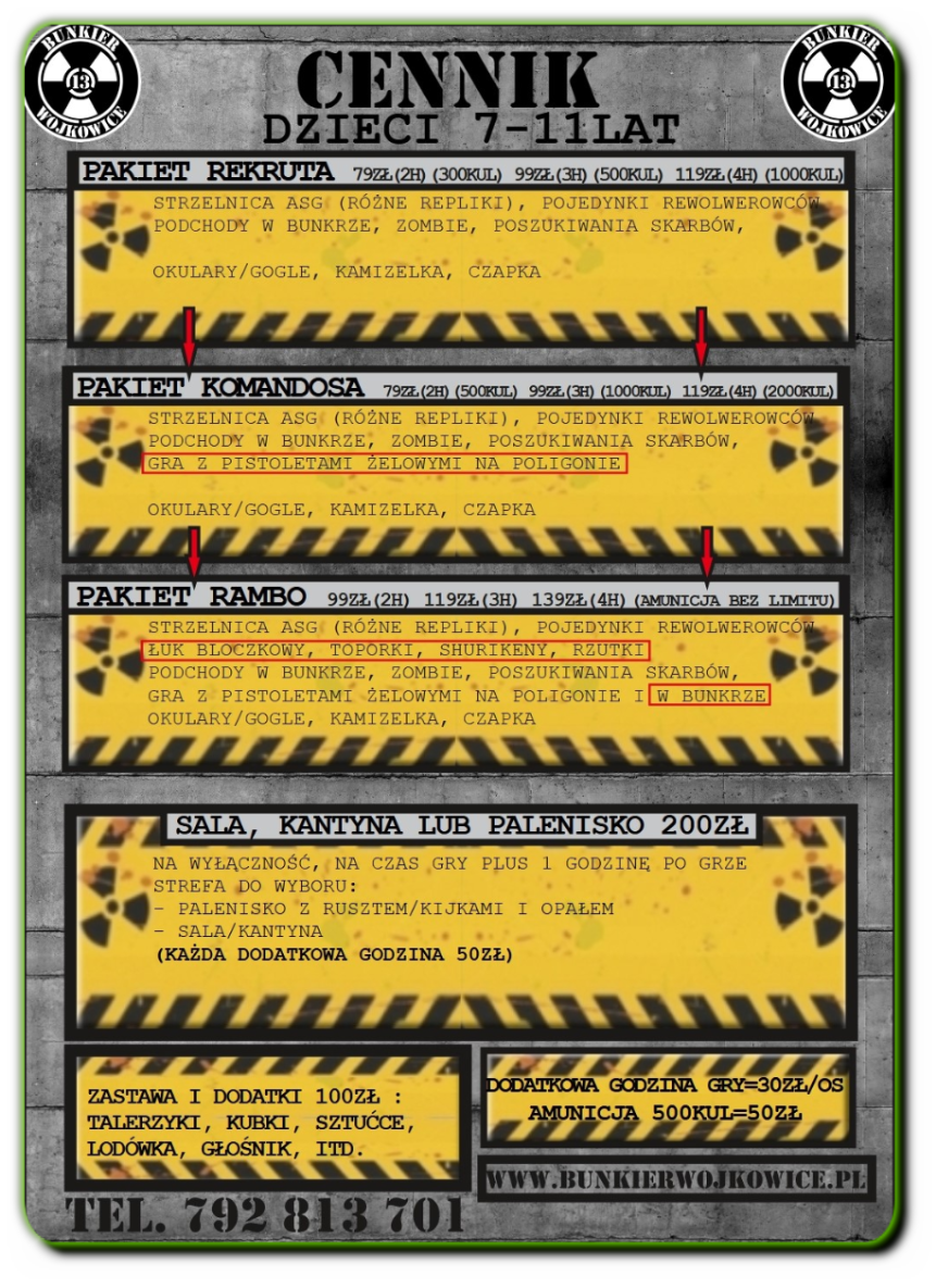 Do zrobienia rezerwacji lub w celu zapytania o dostępność terminu wystarczy wysłać sms [792 813 701] z informacjami: - dzień i preferowana godzina startu - pakiet gry (np. Rambo), oraz ile godzin (2,3,4,5...)